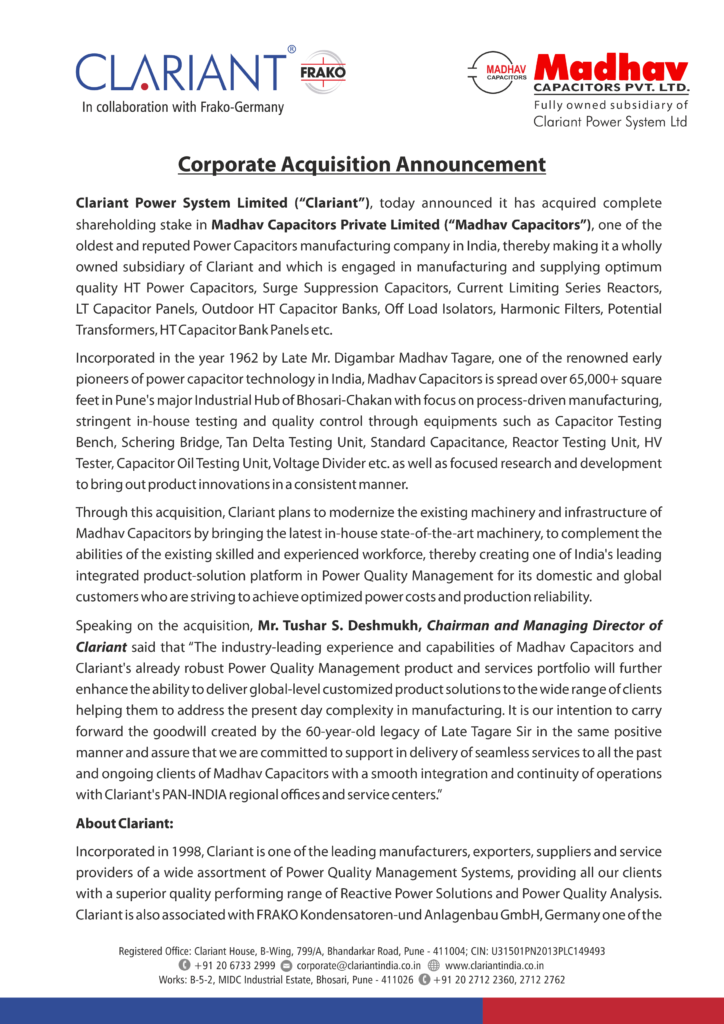 Clariant Power System Ltd. Capacitors is a privately owned company operating in the global market through a powerful sales and distribution network. We offer solutions to save energy and to improve power quality by reactive power compensation and harmonic filtering. Some of our key achievements include: